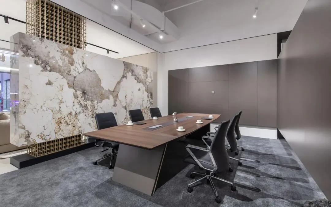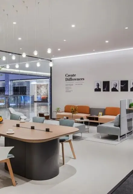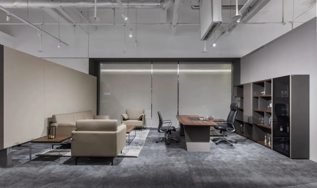 总裁高管空间中,我们采用轻量化吊顶,勾勒出通透的纵向延伸。其间留有呼吸的缝隙——自然光线与空气在此自由流动,打破了空间的压抑感,更隐喻了一种开放、自信的新型领导力姿态。
