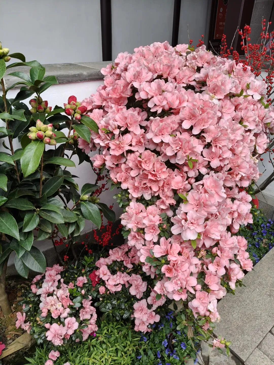 最吸引我的是西洋杜鹃花。花团繁密饱满,粉红花色柔和雅致,层层叠叠的花瓣簇拥在一起,视觉冲击力极强。