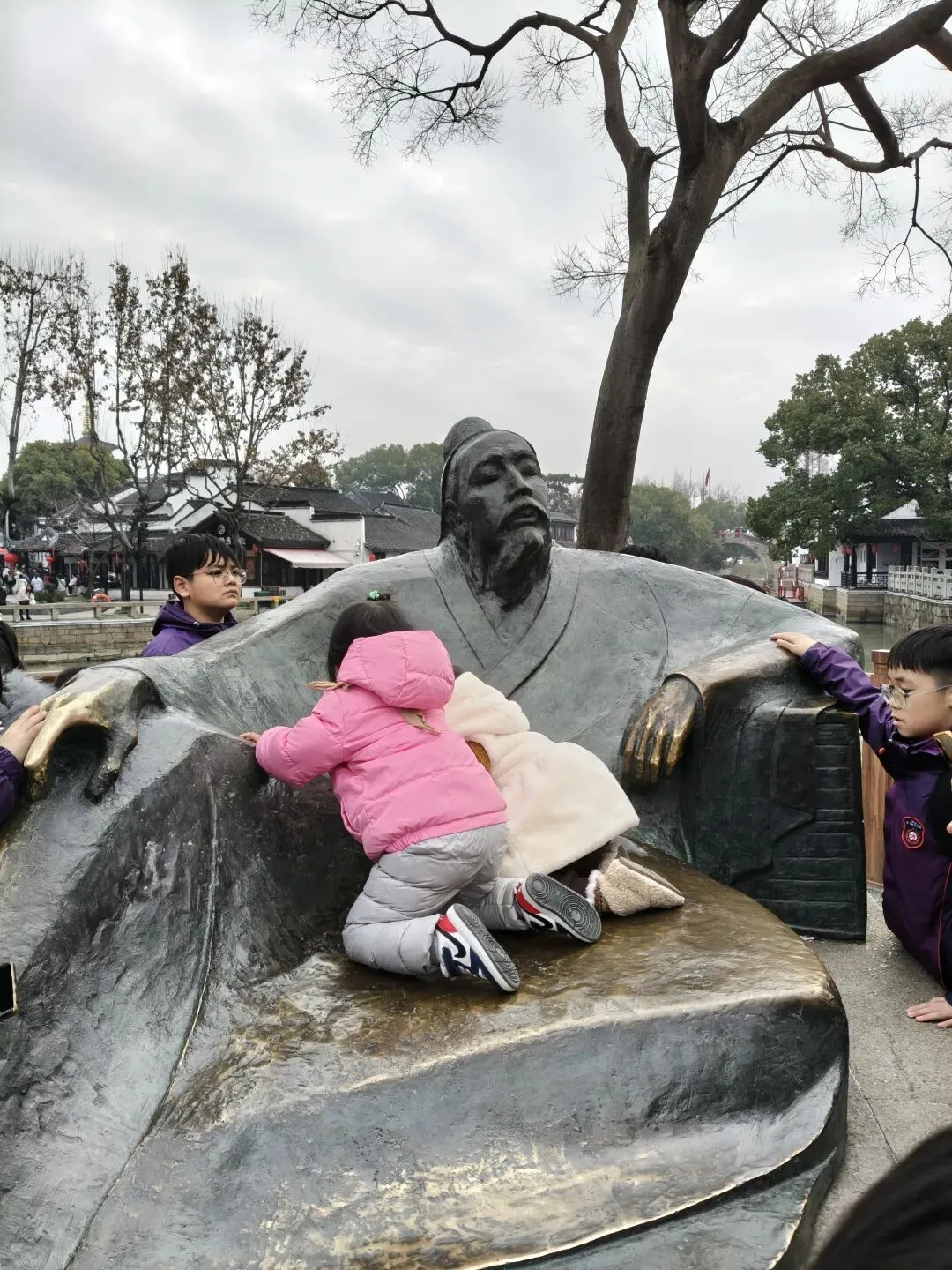 忽然感觉这诗句,已化作了眼前的江风、檐角的铜铃,和暮色里即将响起的钟声。张继铜像的食指被摩挲得金光锃亮,我也伸手摸了摸,沾一沾千年前文人的文气,讨个好彩头。
