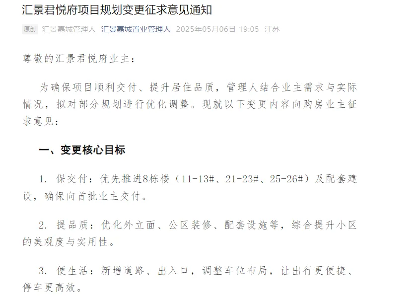 2025年初,徐州市贾汪区人民法院根据江苏弘仁建设集团有限公司的申请,裁定受理徐州汇景嘉城置业有限公司破产重整一案,项目启动破产重整。同年6月份,汇景君悦府项目规划变更征求意见通知:为确保项目顺利交付、提升居住品质,管理人结合业主需求与实际情况,拟对部分规划进行优化调整。