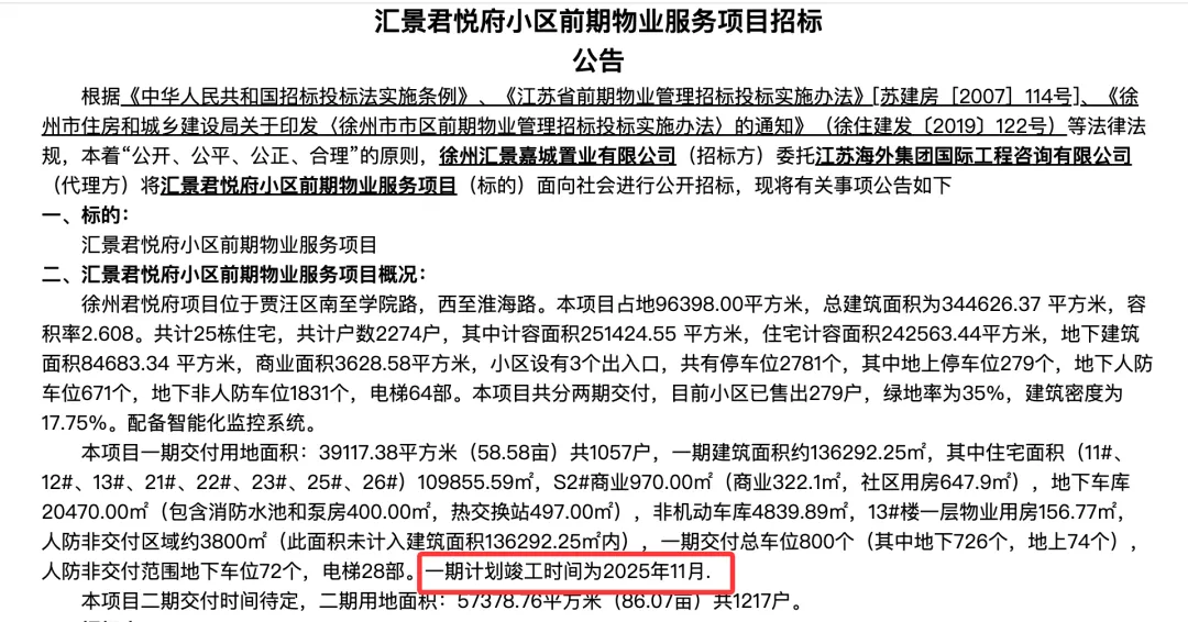 2025年8月份,项目又发布《汇景君悦府小区前期物业服务项目招标公告》,里面提到:一期计划于2025年11月交付,计划交付1057户。