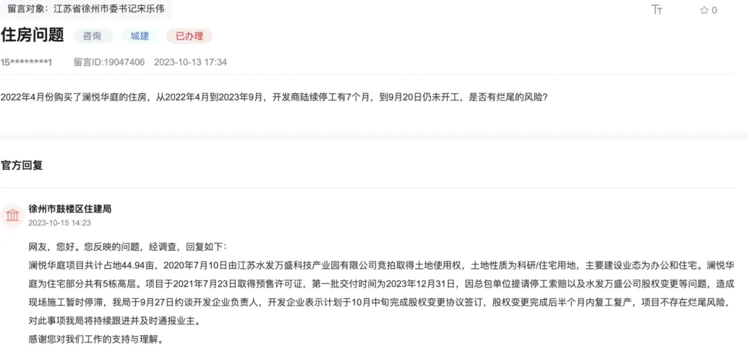 2023年10月13日,有业主在人民网上询问:从2022年4月到2023年9月,开发商陆续停工有7个月,是否有烂尾的风险?
