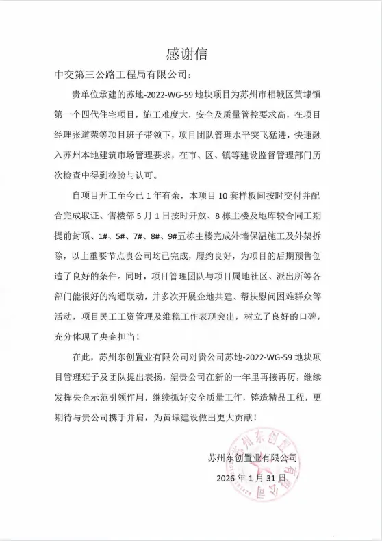 近日,由公司承建的江苏黄埭59地块项目收到苏州东创置业有限公司感谢信。信中,业主对项目团队的专业素养、责任担当与高效履约给予高度评价。