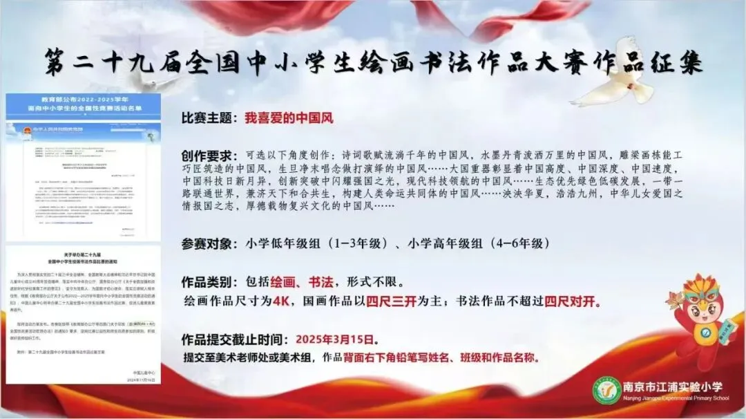 时光荏苒,一学期的美育之旅已近尾声。一直以来,南京市江浦实验小学高度重视美育工作,始终坚守“以美育人、以文化人”的教育初心,将美育工作深度融入校园文化建设与日常教育教学全过程。学校精心规划、用心打造,着力营造浓郁且富有内涵的校园艺术氛围,从校园环境布置到各类艺术活动开展,让美育浸润校园每一个角落,助力孩子们在美的熏陶中健康成长、全面发展。