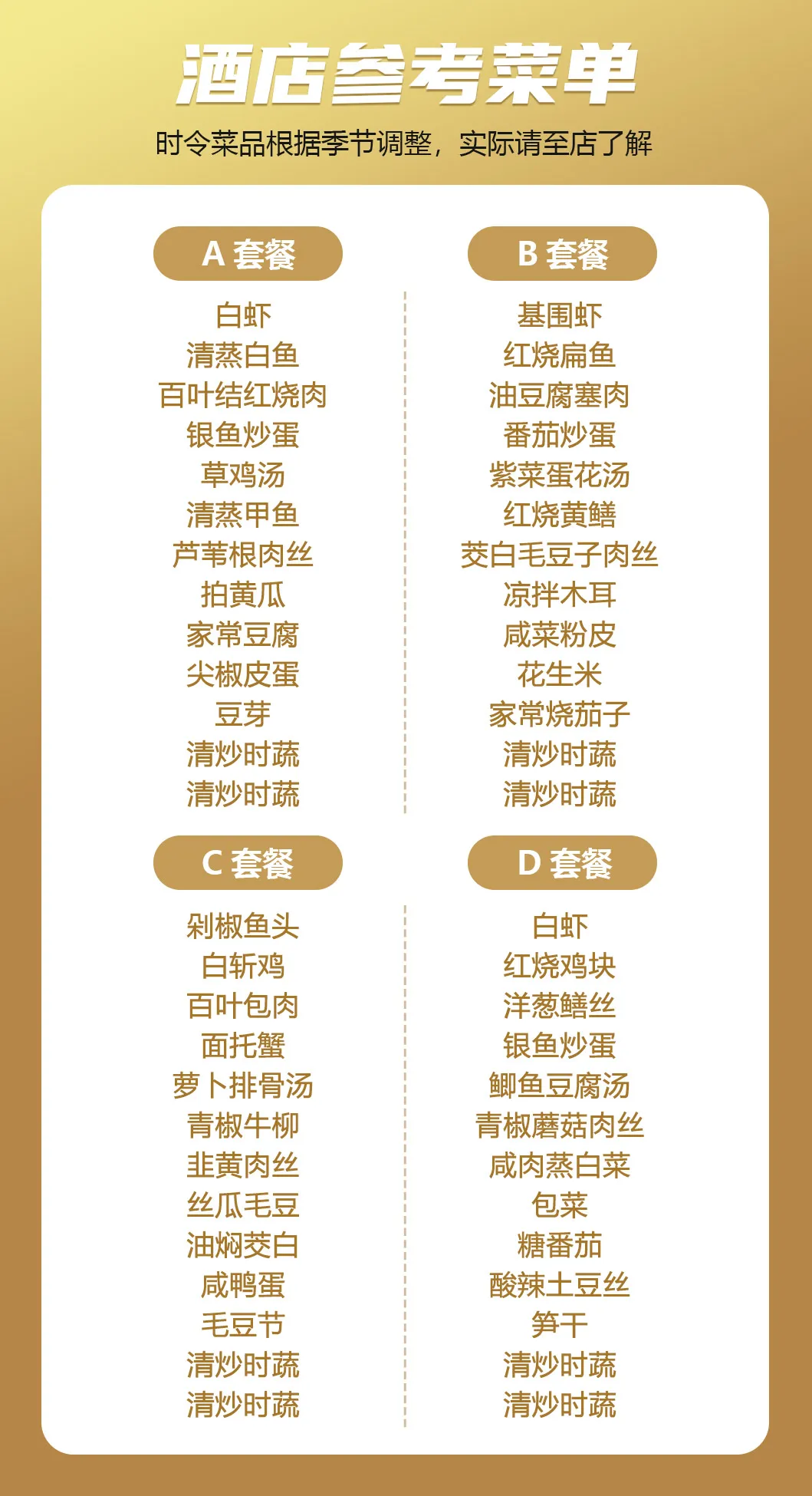 3、用餐: 1早2正/2早4正/3早6正/4早8正(10人一桌,根据人数增减菜品,不用不退);