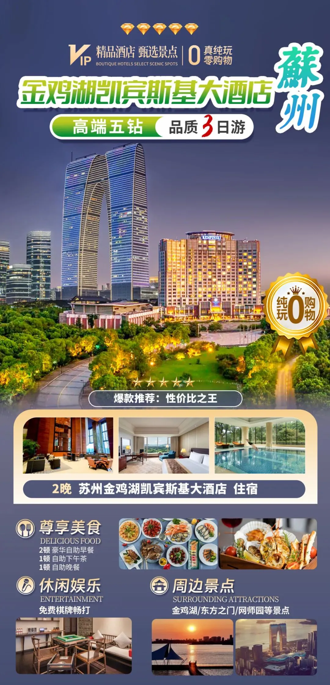 【苏州金鸡湖凯宾斯基大酒店】3天2晚◆2自助早+1自助下午茶+1自助晚餐◆免费棋牌畅打◆周边游金鸡湖/东方之门