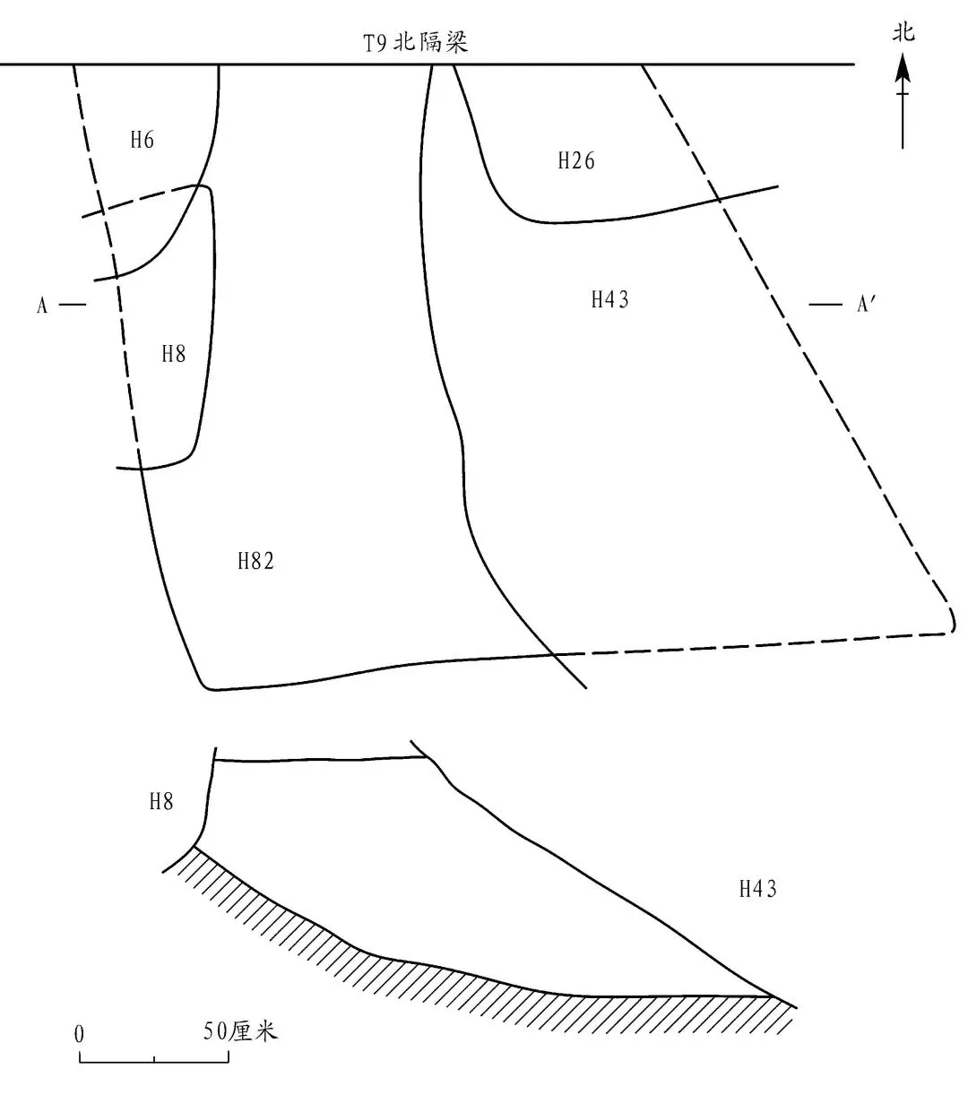 H82 位于 T9 北部,部分延伸进入探方北隔梁。开口于③层下,开口距地表 0.8 米,打破⑦ 、 ⑧ 、⑨层。不规则形,口大底小壁内斜,底部呈斜坡状。口径长约 2.2、宽约 2、深约 0.8 米(图九)。填土为灰褐色花土,土质较疏松,包含少量陶片、原始瓷片。可辨器形有原始瓷盅、原始瓷碗和泥质灰陶盆等。