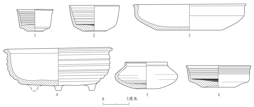 1. 原始瓷盅(H82∶2) 2、6. 原始瓷碗(H82∶4、G10∶2) 3、4. 陶盘(H82∶5、H82∶6) 5. 原始瓷罐(G10∶1)
