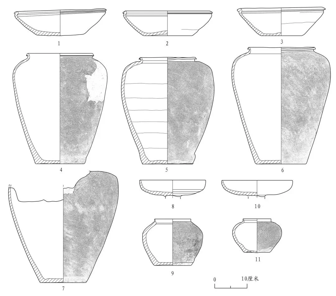 1—3. 陶盆(M1∶1-1、2-1、3-1) 4—7. 印纹硬陶坛(M1∶1-2、2-2、3-2、4)8、10. 陶豆盘(M1∶5-1、6-1) 9、11. 印纹硬陶罐(M1∶5-2、6-2)