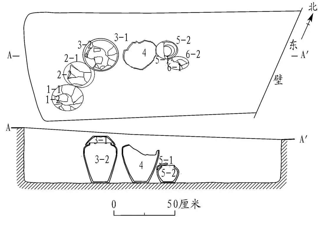 ⑥层:深灰绿色土,土质较致密,包含少量泥质陶片及夹砂陶。距地表深 0.65 ~ 0.7、厚0.05 ~