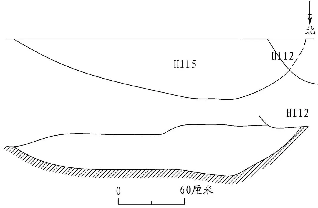 H115 位于 T10 南壁处,南部延伸进入坡道下。开口于⑤层下,被 H112 打破,开口距地表约1.75 米,打破⑧层。揭露部分平面近似半圆形,坑壁内弧,斜平底。东西长 2.66、南北宽 0.5、深0.46米(图二一)。填土为浅灰绿色花土,土质致密,含草木灰。出土 1 件泥质黑陶残片,为圈足盘,其上刻绘有鸟纹。