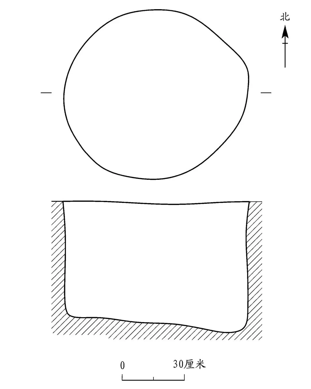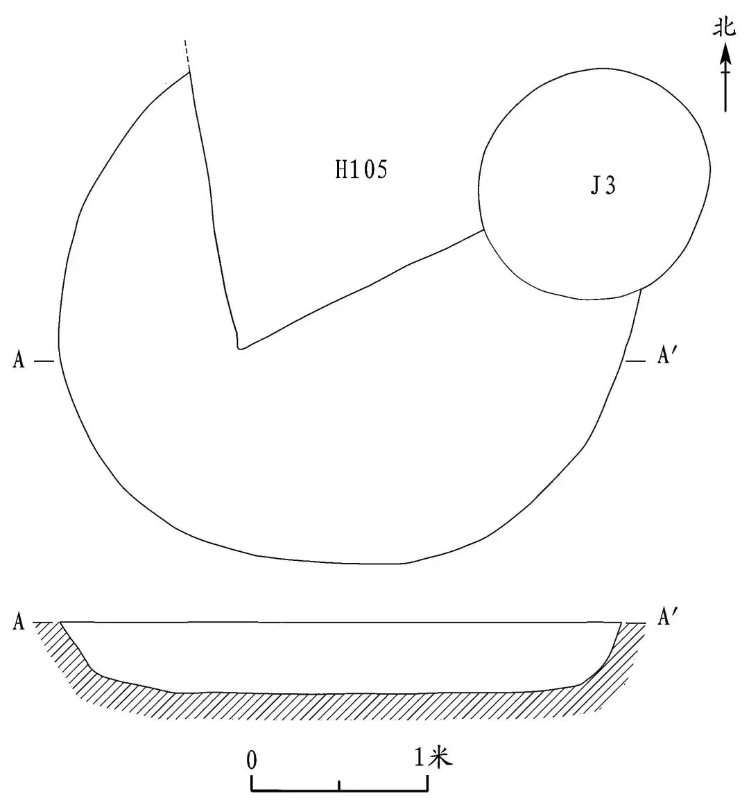 H106 位于 T8 中部。开口于⑦ 层下,打破⑧ 、⑨层,北部被 H105、J3 打破,坑口距地表 1.2米。残剩部分形状呈半圆形,口大底小,壁内斜,底部较平。口径约 3.2、底径约 2.1、深约 0.4 米(图二六)。填土灰绿色,土质较致密,为一次性堆积,