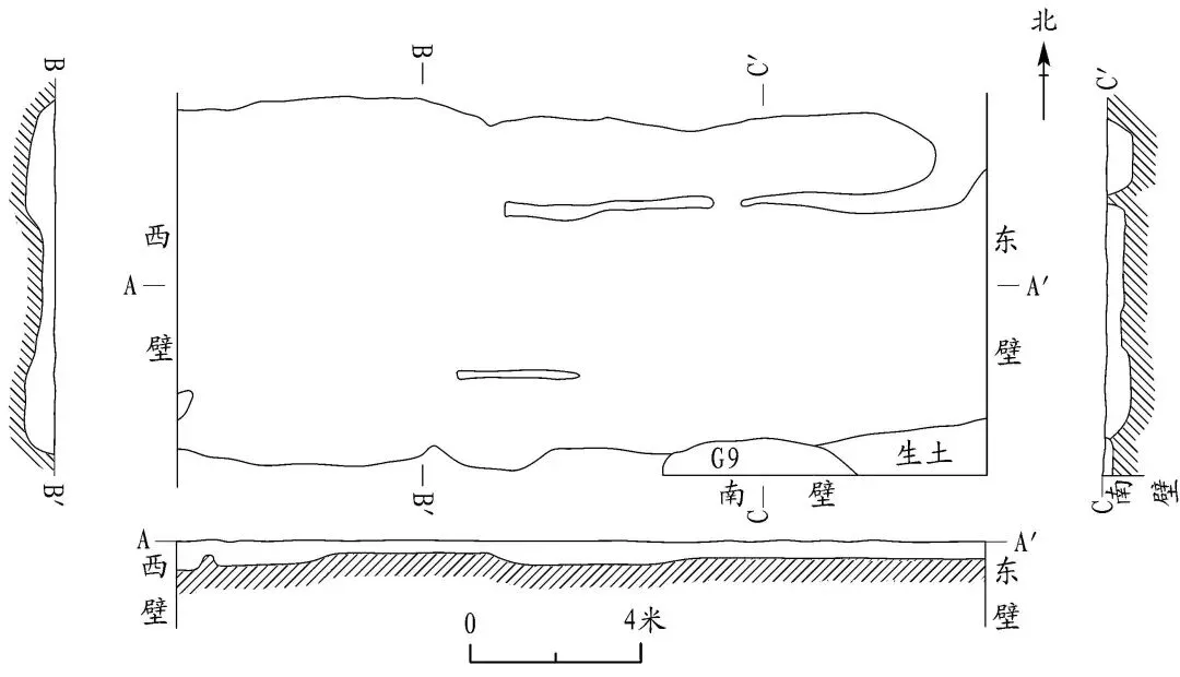 伸进入探方壁。开口于⑧层下,距地表 1.2 米,海拔 约 0.15 ~ 0.4 米 ,揭 露 部 分 东 西 长 19、南 北 宽