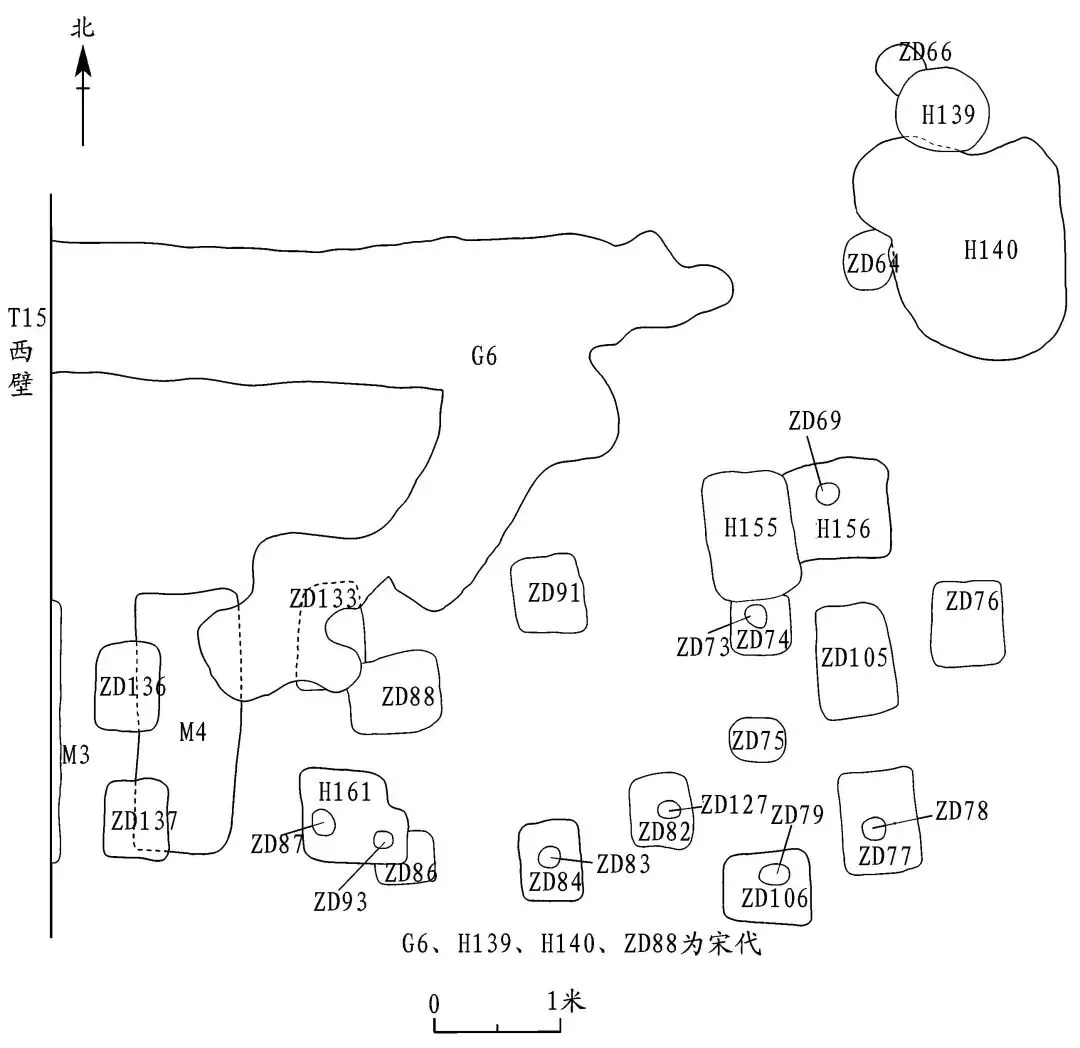 柱 洞 均 开 口 于 T15 的 ③ 层 下 ,打 破 生 土 。 H161 和 ZD87、ZD93 组 合 、ZD84 和 ZD83 组 合 、 ZD82 和 ZD127 组合、ZD75、ZD74 和 ZD73 组合、 ZD106 和 ZD79 组合、ZD77 和 ZD78 组合、ZD76 、 ZD136、ZD137、ZD91 的填土较一致,均为黑灰色花土,可能为同一时期建筑的柱洞,ZD74 被 H155打破,ZD136 和 ZD137 打破 M4。近方形柱坑口大底小,壁略斜,边长 0.46 ~ 0.88、深 0.16 ~ 0.66 米;圆 形 柱 洞 口 大 底 小 ,直 径 0.18 ~ 0.23、深 0.06 ~
