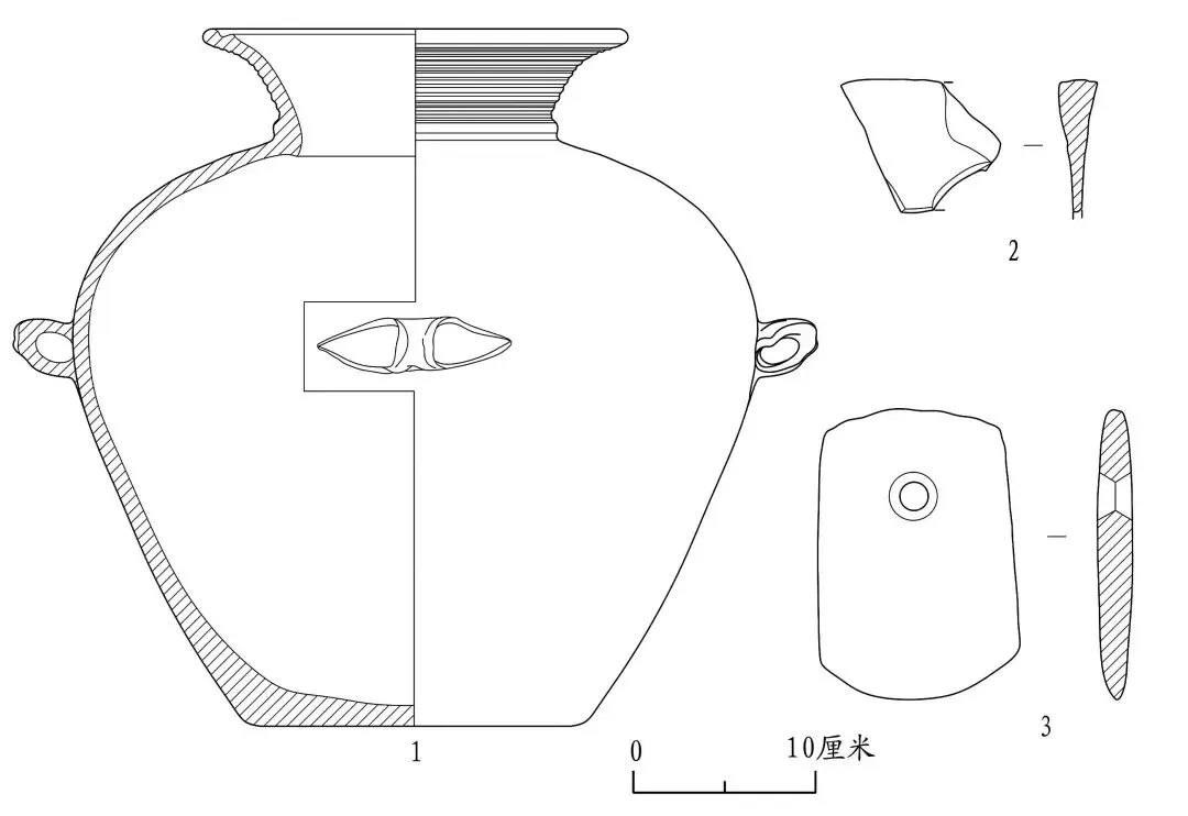 1. 陶罐(H106∶1) 2. 砺石(H106∶2) 3. 穿孔石斧(H118∶1)