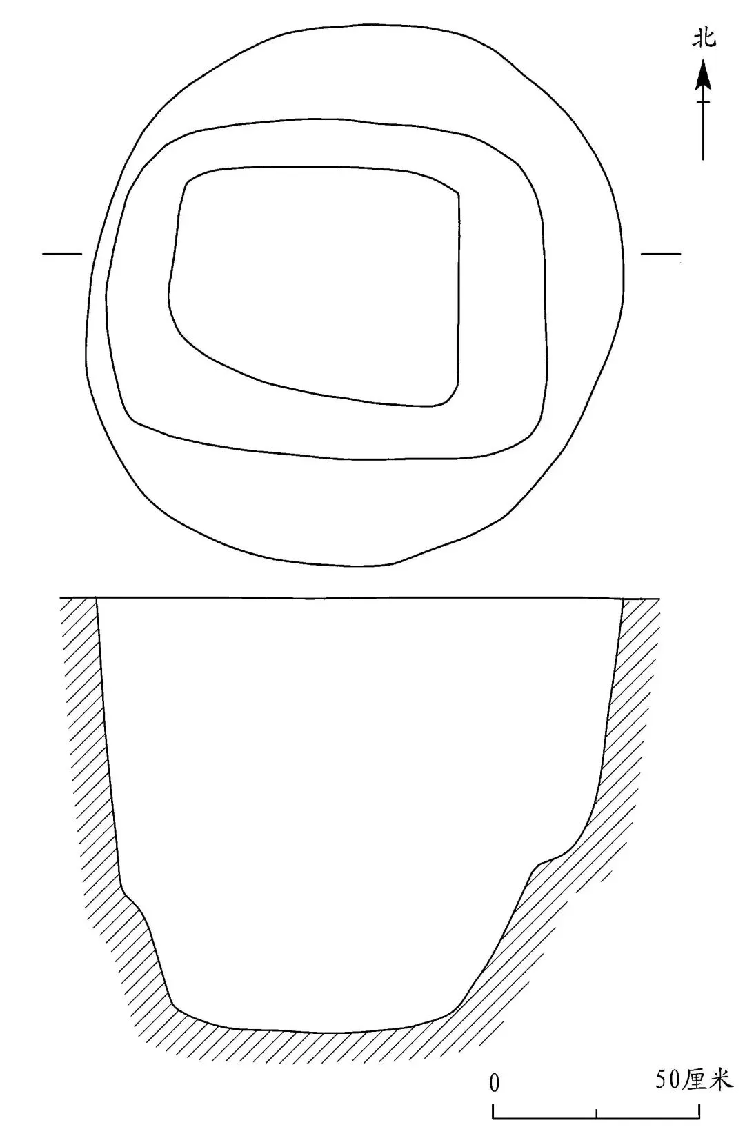 J3 位 于 T8 中 东 部 。开口于⑦层下,井口距离地表 约 1.25 米 ,打 破 H105 、 H106、⑧ 、⑨层 S20 至生土。开口平面近圆形,中部内收至底形状近圆角长方形。口径约 1.3、底径约 0.5、深约 1.06 米(图三〇)。填土为灰绿色,土质较疏松,包含有少量陶片,可辨器形有鼎、釜、罐、盆等。