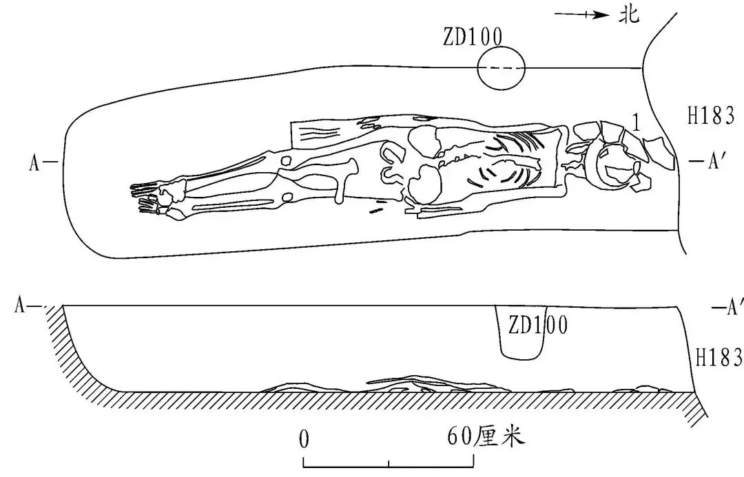 M5 位于 T14 探方东南部。开口于③层下,打破生土,竖穴土坑墓。长 2.55 、宽 0.7 ~ 1.05、深 0.6 米,方向351°。墓主为成年男性,身高约 1.7 米,脊椎呈 S 形弯曲,俯身直肢葬。