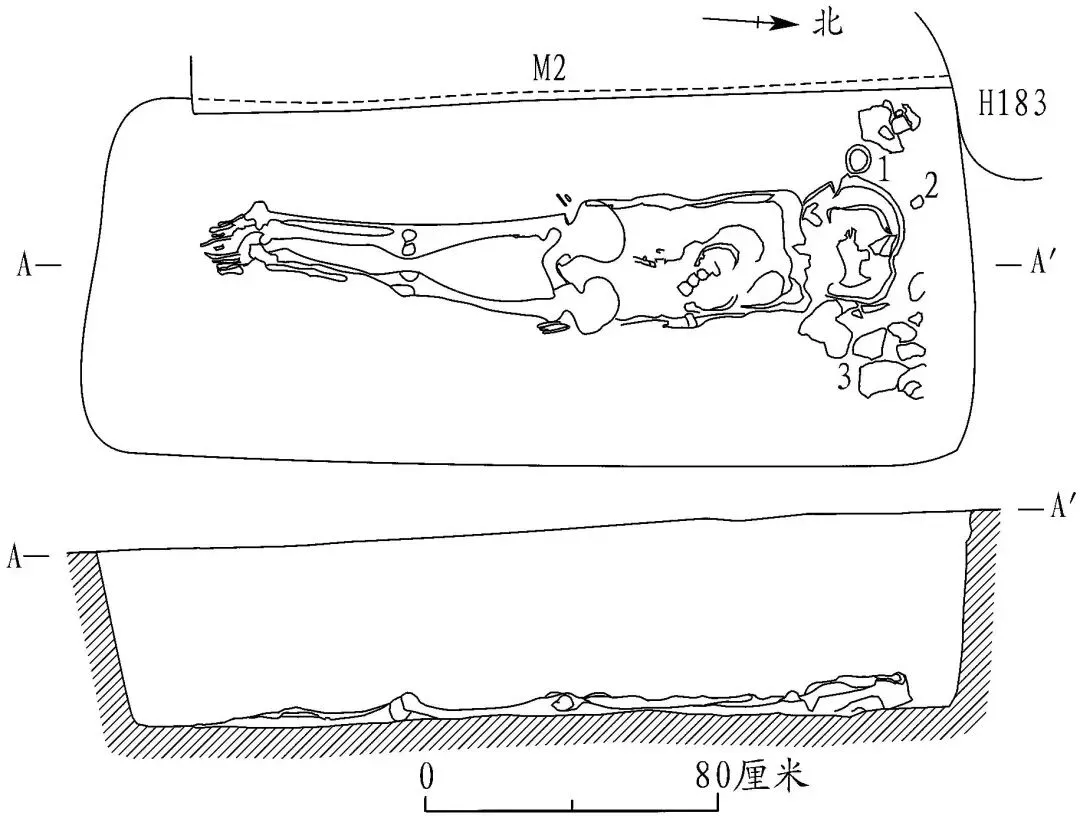M2 位于 T14 探方东南部。开口于③层下,打破 M3 和生土,竖穴土坑墓。长 2.05、宽 0.5、深0.2 米,方向359°。墓主为成年男性,身高约 1.45
