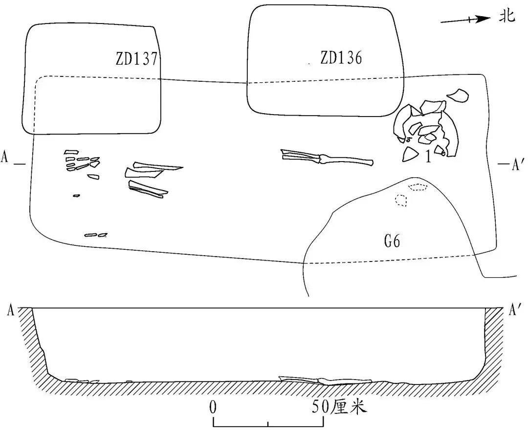 G10 位于 T16、T17 中部。开口于⑤层下,开口距地表 0.55 米。平面形状近呈长方形,口大底小壁略内斜。口部长 19、宽 3.5 ~ 4.1、深 0.4 ~ 0.9米(图一〇)。填土为灰白锈土,土质疏松,包含有少量原始瓷片和陶片,可辨器形有原始瓷碗、原始瓷罐、陶罐等。