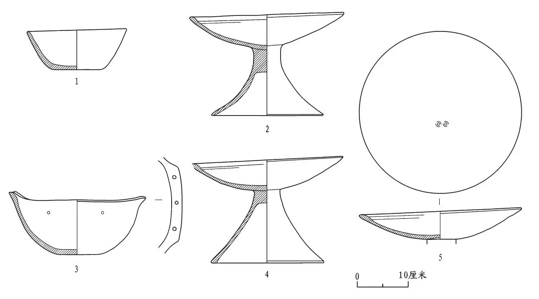 1. 陶盆(M2∶1) 2、4、5. 陶豆(M3∶1、M4∶1、M5∶1) 3. 陶匜(M3∶2)
