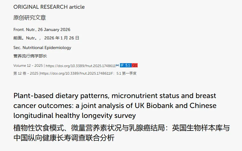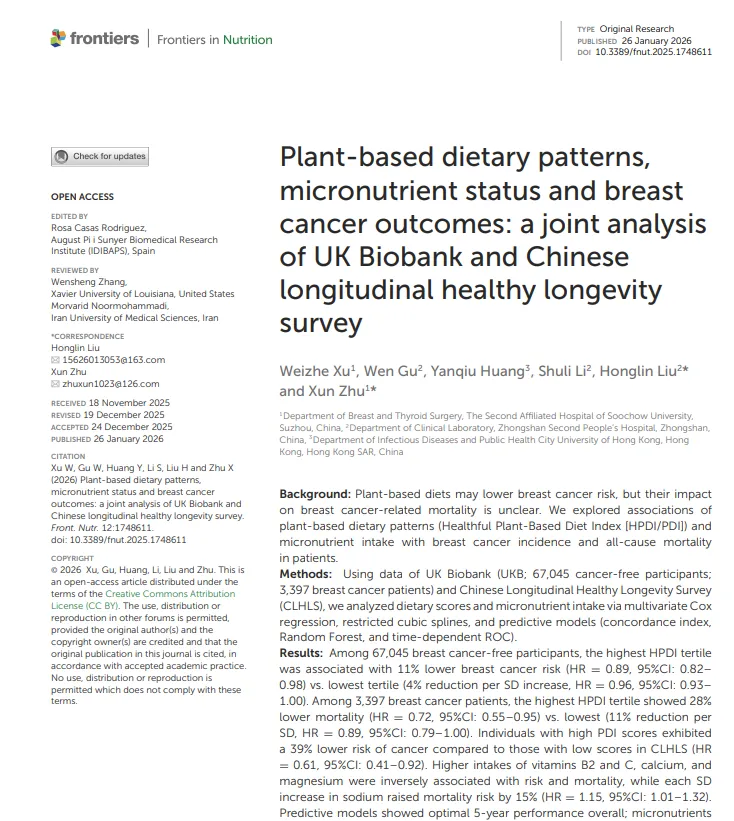乳腺癌是全球范围内女性最常见的癌症之一。研究表明,植物性饮食可能有助于降低乳腺癌的风险,但其对乳腺癌相关死亡率的影响尚不明确。因此,探讨植物性饮食模式和微量营养素摄入与乳腺癌发病率及全因死亡率的关联具有重要意义。