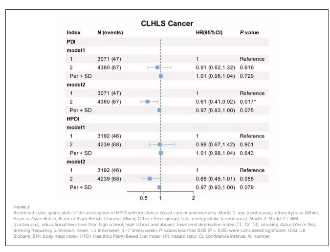 高植物性饮食指数(PDI)评分的个体癌症风险降低39%(HR = 0.61, 95% CI: 0.41–0.92)。