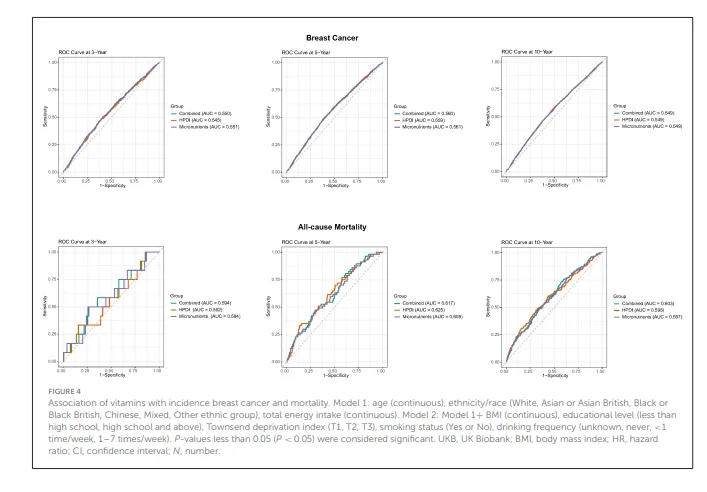 预测模型显示,五年预后表现最佳。微量营养素在不同时间点对乳腺癌风险的预测效果最佳,而HPDI在五年死亡率预测中表现最佳(AUC = 0.625)。合并模型在十年预后方面表现更优。