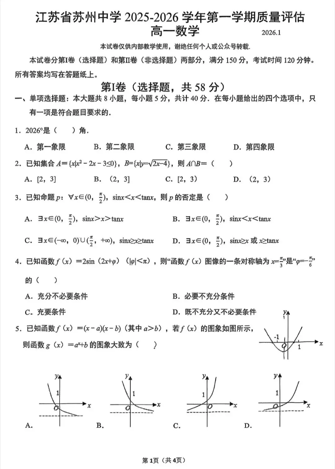 解题 | No.815 2026年苏州中学高一上期末数学试卷