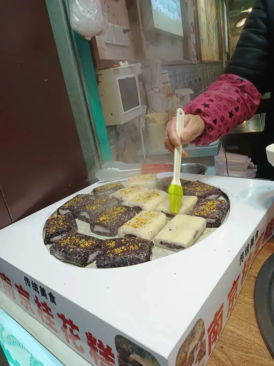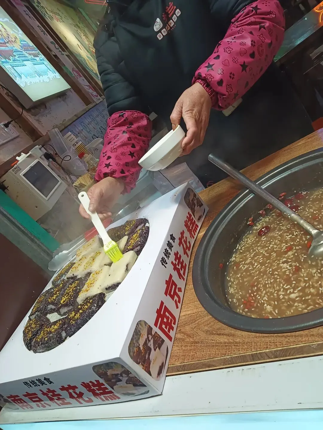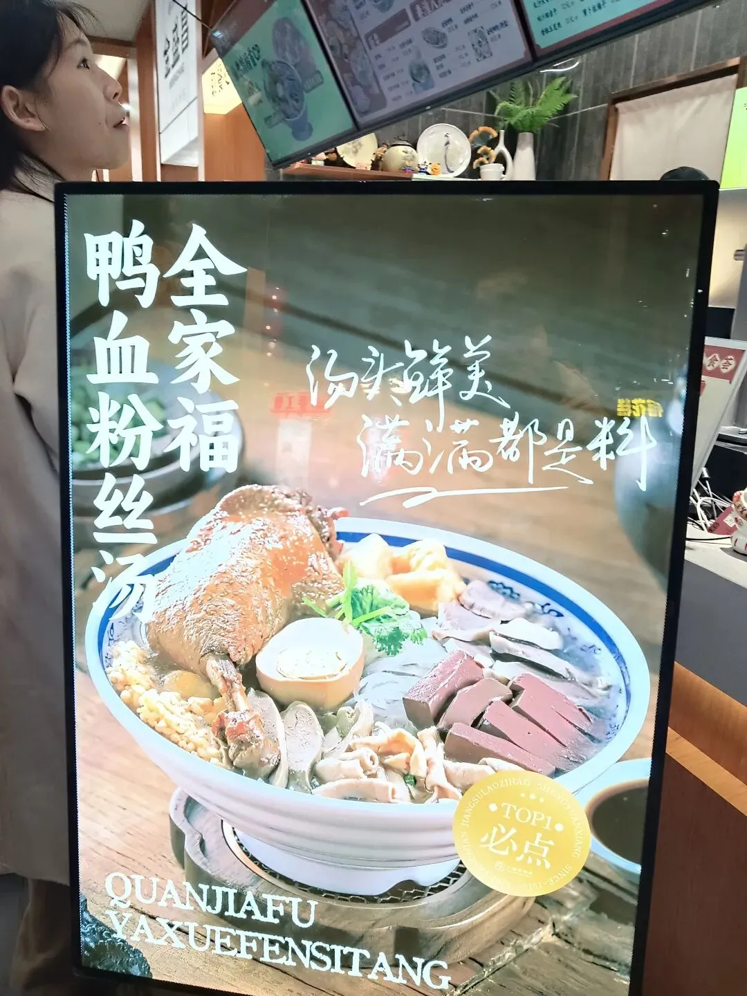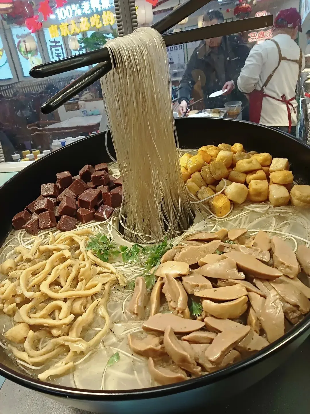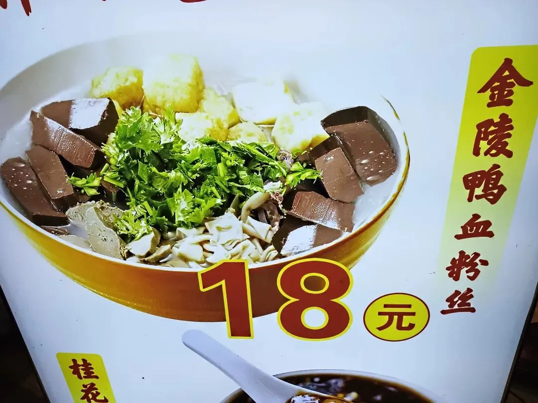 先声明一下,当街溜子的我随手拍照,不认识任何老板。南京的小吃著名的很多,桂花糕、桂花糖藕、梅花糕,其中最被大家所接受的是鸭血粉丝汤。多年前,我在工厂上班,每个月发了工资后加班到18点时,同事就请我吃鸭血粉丝汤,吃了再回家。前些年,我写过,还上了中国劳动保障报。到南京来旅游不吃鸭血粉丝汤就如同没有来过南京一样,南京的最著名小吃除了桂花藕、糖芋苗外就是鸭血粉丝汤。南京鸭肴甲天下,鸭血粉丝汤是金陵一绝,也是南京本地的传统名吃,南京人最爱的小吃,街头巷尾到处都是鸭血粉丝汤店,而且食客如云,可见鸭血粉丝汤在民间的影响力。各地的美食节上,南京鸭血粉丝汤也有一席之地,是众多美食家争先品尝的一碗佳肴。前些天,我们一行去安徽鸠鹚古镇,众多的小吃店沿街排开,包括云南过桥米线、武大郎饼店、重庆麻辣店、武汉热干面店等,金陵鸭血粉丝汤店在冷清的小镇看上去还是很热闹的,不少游客都排队等候。鸭血粉丝汤是是南京小吃中重要的代表之一,也是赫赫有名的以鸭为特色的美食之一。