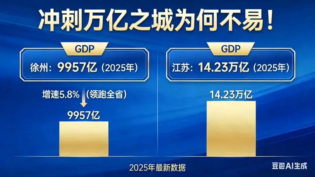 2025年徐州GDP9957亿晋级万亿城市失败了,GDP增长全省第一,放在全国也是非常优秀了,虽然江苏不差万亿城市,但徐州就只差这40多亿,就难倒了?