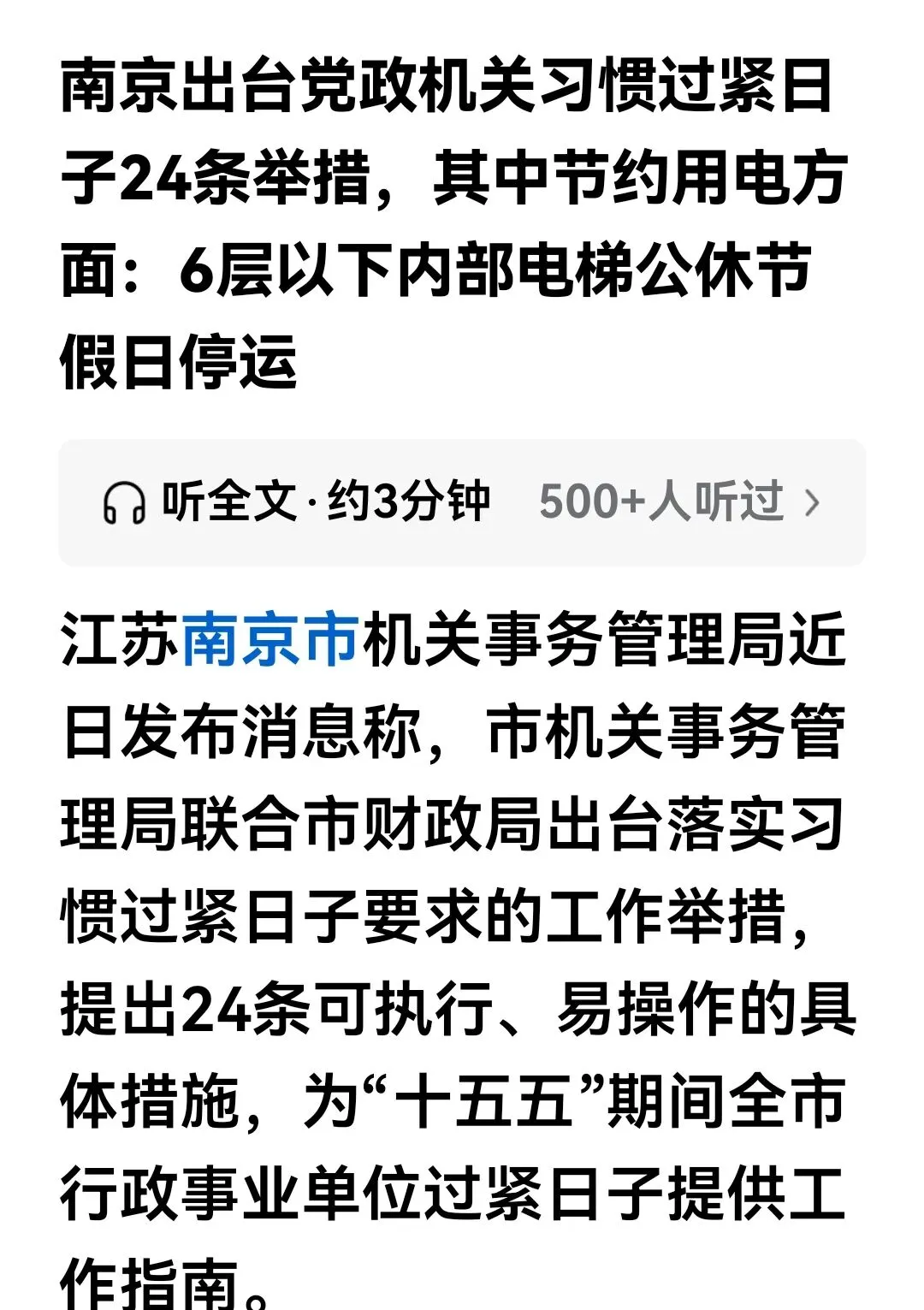 但显然,南京的这个“新政”把经念歪了,成了挺“抠门”的越管越繁琐的政策。就以这次媒体聚焦、大家议论的热点一一节约设备用电支出来说。新规提出,“公休及节假日期间,原则上各单位内部使用的6层及以下建筑电梯停止运行,6层以上建筑停止运行电梯数量应控制在一半以上(消防电梯除外)。”这样的规定,实在让人匪夷所思!公休及节假日期间仍加班的人,要么是有加急的事情,要么是要加班加点,绝不是来爬楼梯锻炼身体的,如果遇到一些携带物品、身体不适者,就更麻烦。节约不是这么个既没有关怀与温度,又不通人情、不够友好的作派。再说,正常的电梯运行能花多少钱?不装电梯岂不是更省电费更省钱?厉行节约一定要实事求是,凭主观想象给别人的正常工作与生活带来不便,真是站着说话不腰疼啊!