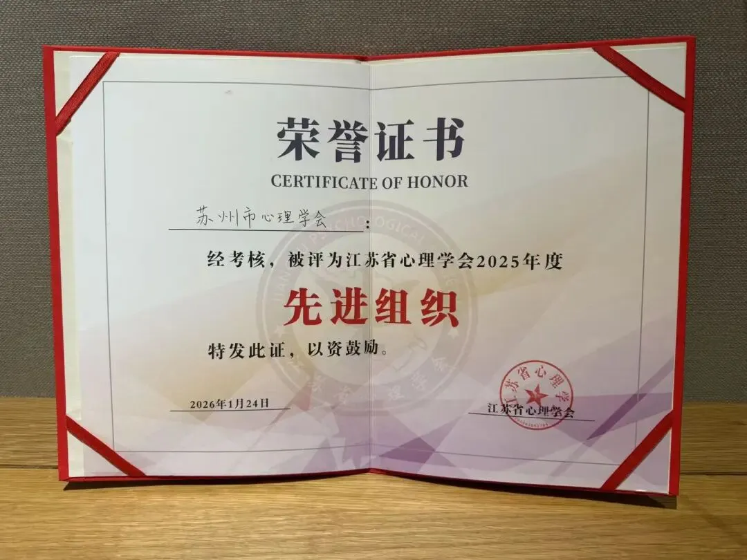 2026年1月24日,江苏省心理学会暨各地市心理学会在南京师范大学随园校区召开2025年度工作总结交流研讨会及评优会,会议总结了2025年各个地市心理学会、专业委员会的发展成果,并对各地市心理学会和省心理学会所属专委会进行了评优工作。会上,苏州市心理学会被江苏省心理学会评为2025年度“先进组织”。