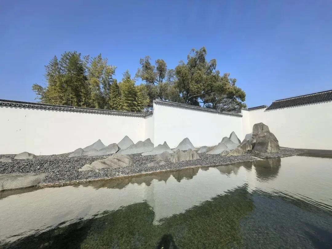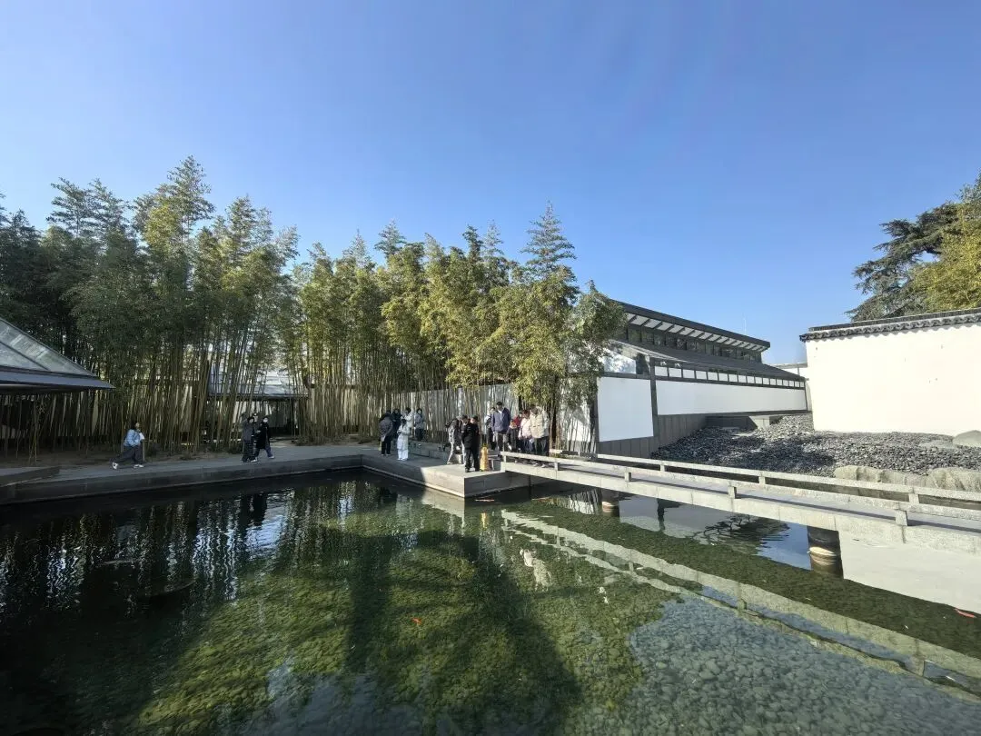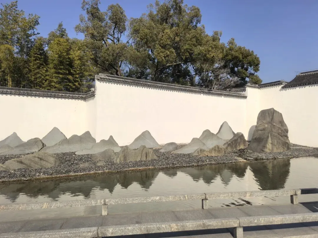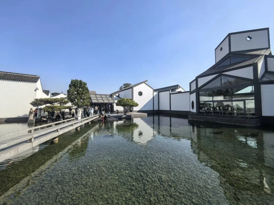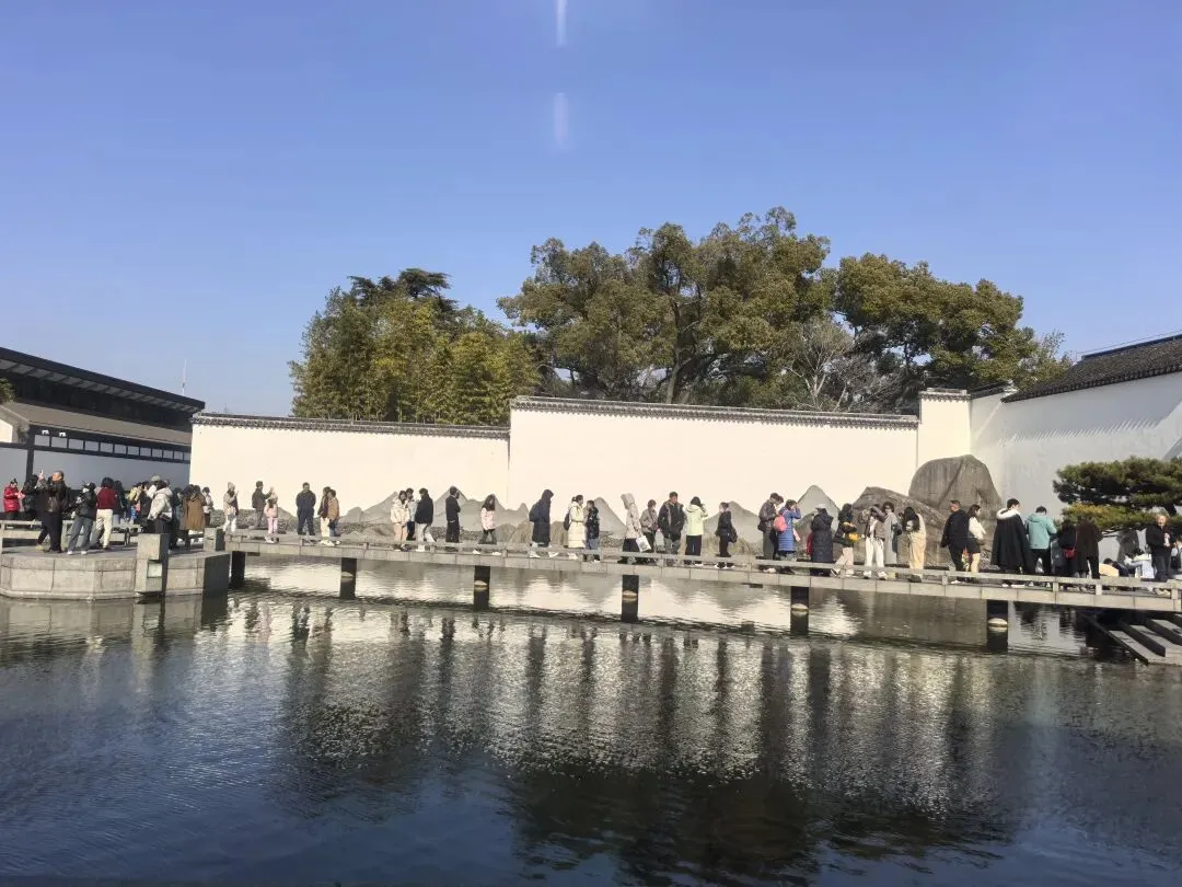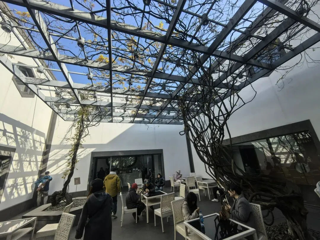 随便一个走廊都是这样倒影如画,阳光打射在这白色墙壁上既补充光线又在地面形成斑驳的倒影。桥上旅客络绎不绝,都在观赏自己景色,可没想你我均在我你的画中游。冬季冬青和松树仍然翠绿独傲迎春。这就是一个院子里的四季感知。这组片石假山是以"宋四家"之一米芾(fú)的一幅作品为蓝本,"以壁为纸,以石为绘",借拙政园白墙为纸,把巨石劈切成片,高低错落地叠放堆砌于墙前,成就了主庭院北墙之下这组独创的片石假山。若是在朦胧的烟雨季节,远远望去,如同一幅绘在墙上、浮在水中的水墨山水画。东廊是紫藤园、现代艺术厅、文创商店和儿童体验中心,出口也可以走这边。这是紫藤园,这不是文徵明种的那棵,文种的那在忠王府,期待下一篇里介绍。还有带的零食只能在这里面吃,博物馆里禁止享用,别问我是怎么知道的……哈哈……文创都在这能买到,满额也可以邮寄,也可以在她的淘宝的网上商城购买。有惊喜哦……白色粉墙将成为博物馆本馆的主色调,外面白墙再加这树影,典型的江南水墨画……