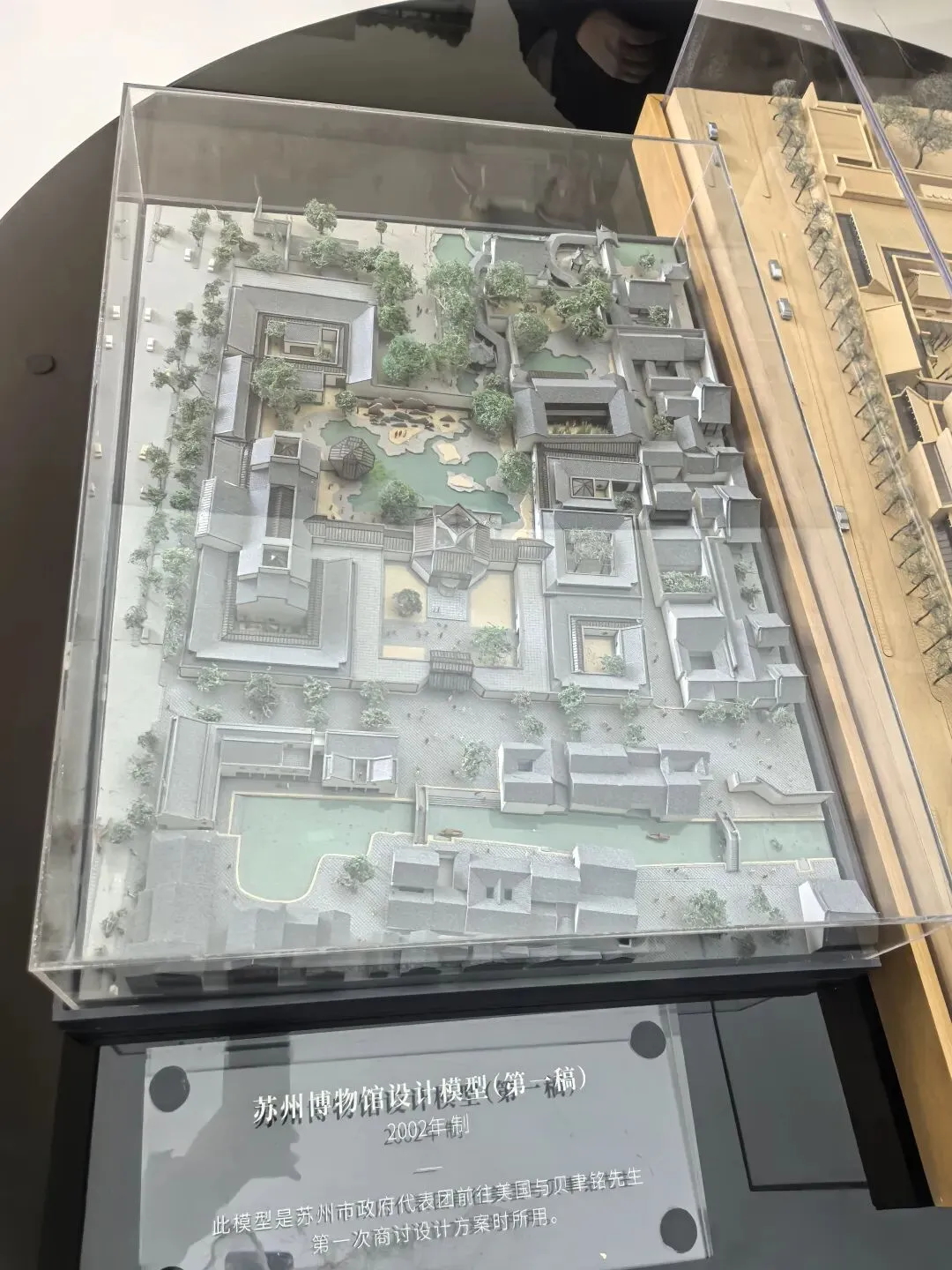 观前导览室有2002年的苏州博物馆设计模型(第一稿),此模型是苏州市政府代表团前往美国与贝聿铭先生第一次商讨设计方案时所用。