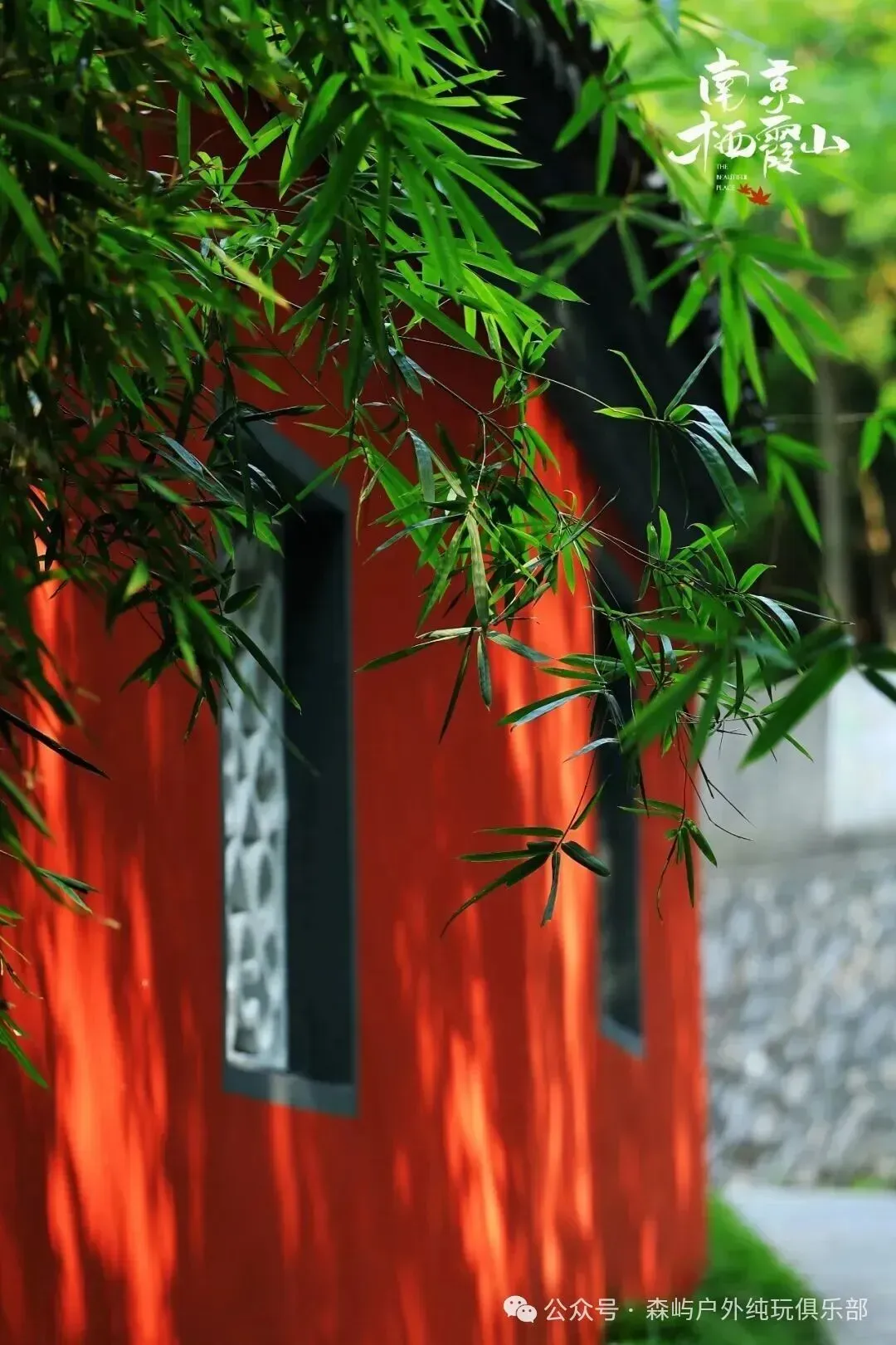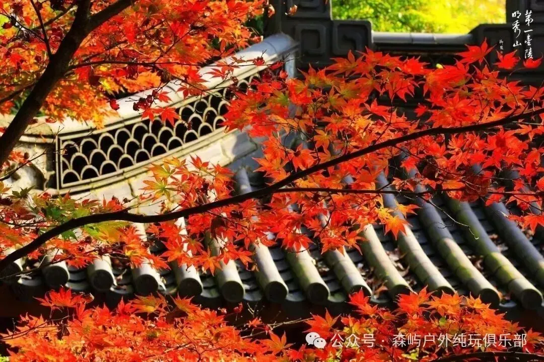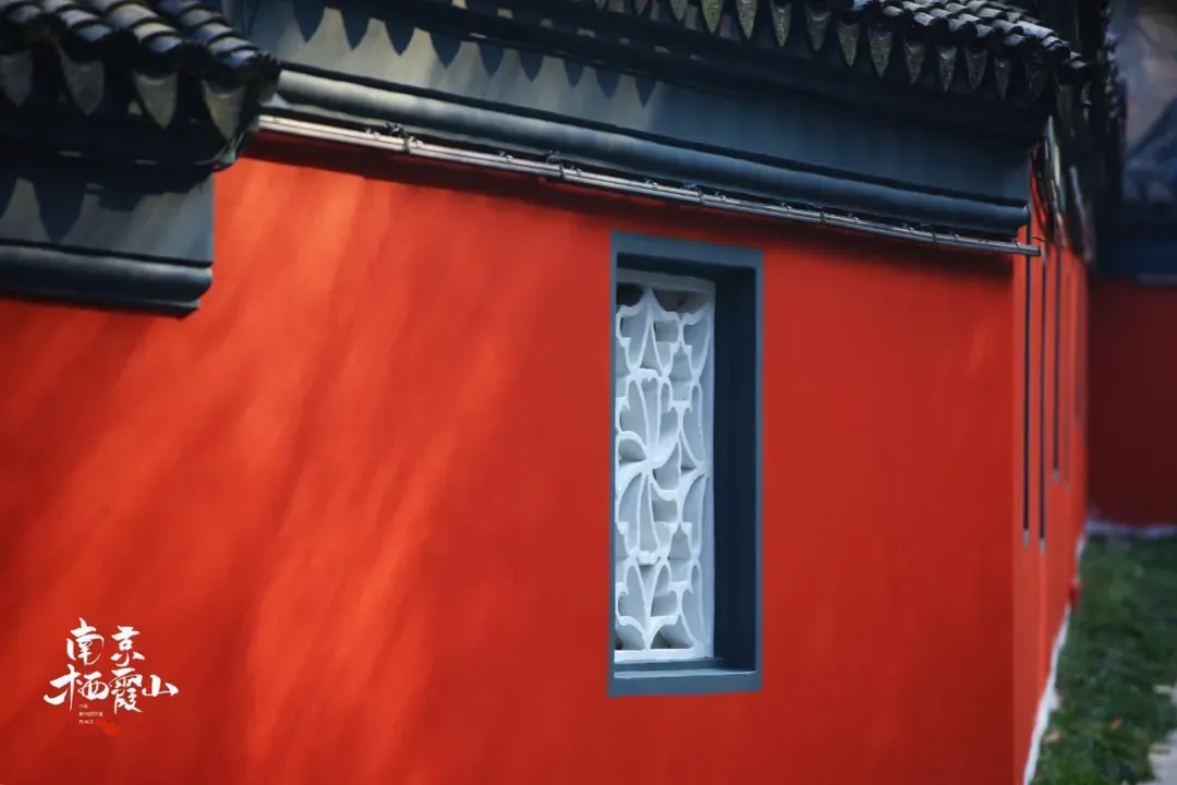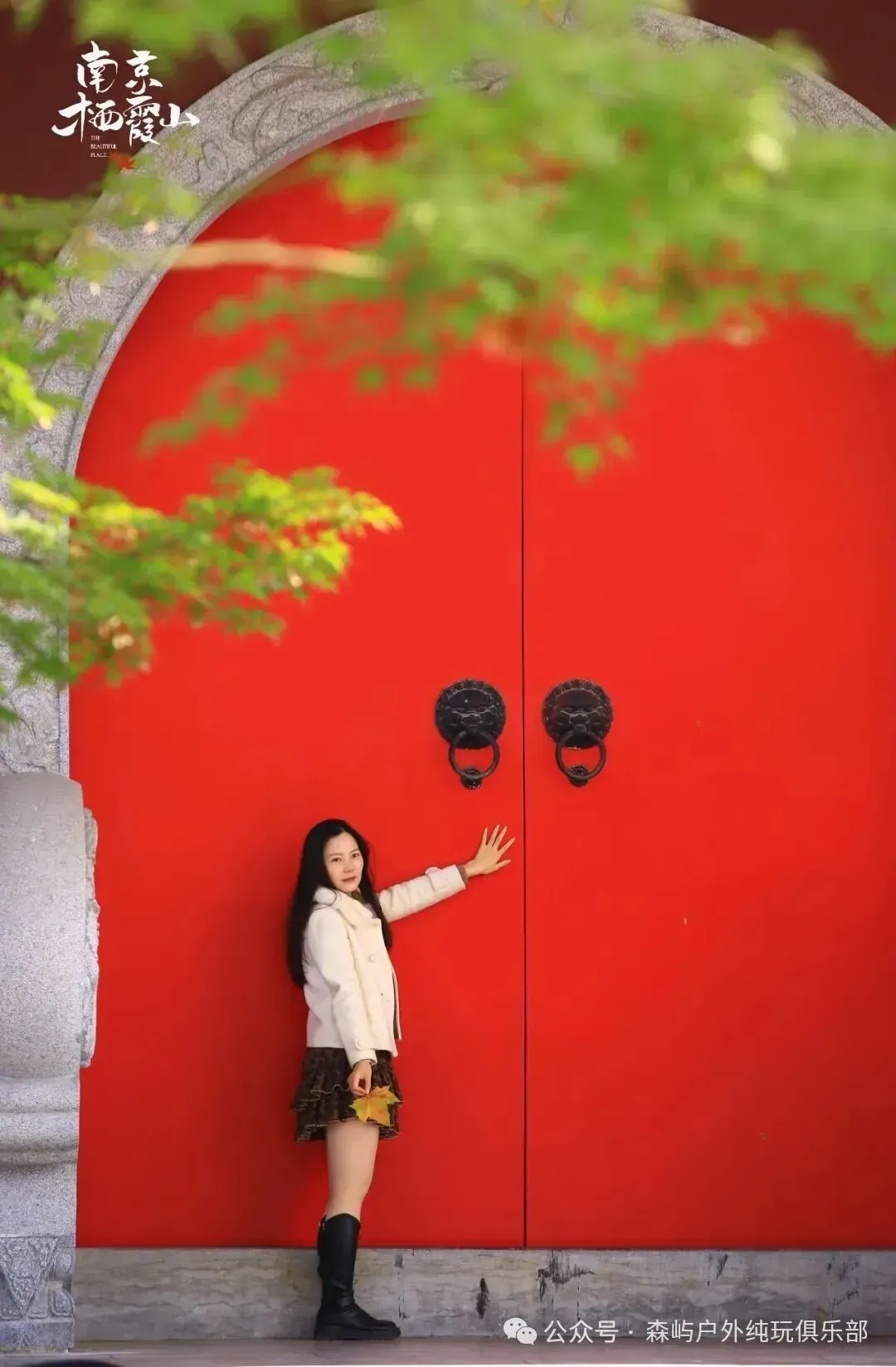 红枫,终年常红的“四季明星”,从春天热烈到冬天。其掌状5-7裂的叶片小巧秀气,紫红色枝条在山林间迎风舒展,是栖霞山中一直陪伴在你追“枫”路上的伙伴。但今年爬过山的人都在传,“红墙+红门”才是真正的“流量密码”。朱红的墙在青瓦黛树间一立,就是刻在中国人骨子里的审美暴击。