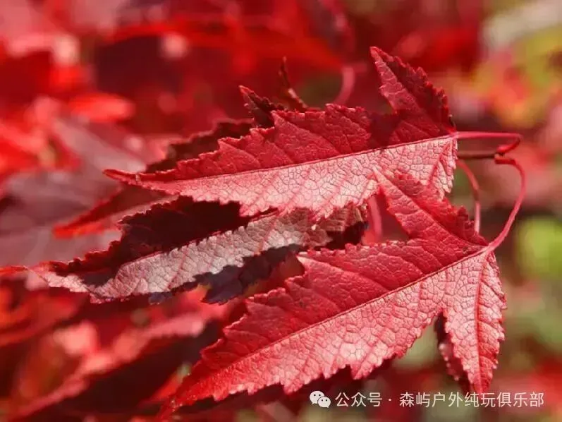 三角槭,标准的三角形裂片,精致小巧,边缘光滑整齐,完美诠释着“枫”中“几何美学”。随着气温降低,栖霞山三角槭的叶片也慢慢变成暗红色,低调但仍不失韵味。三角槭的树形舒展,枝条纤细,红叶在阳光下通透发亮,自带文艺滤镜,拍照氛围感满满~