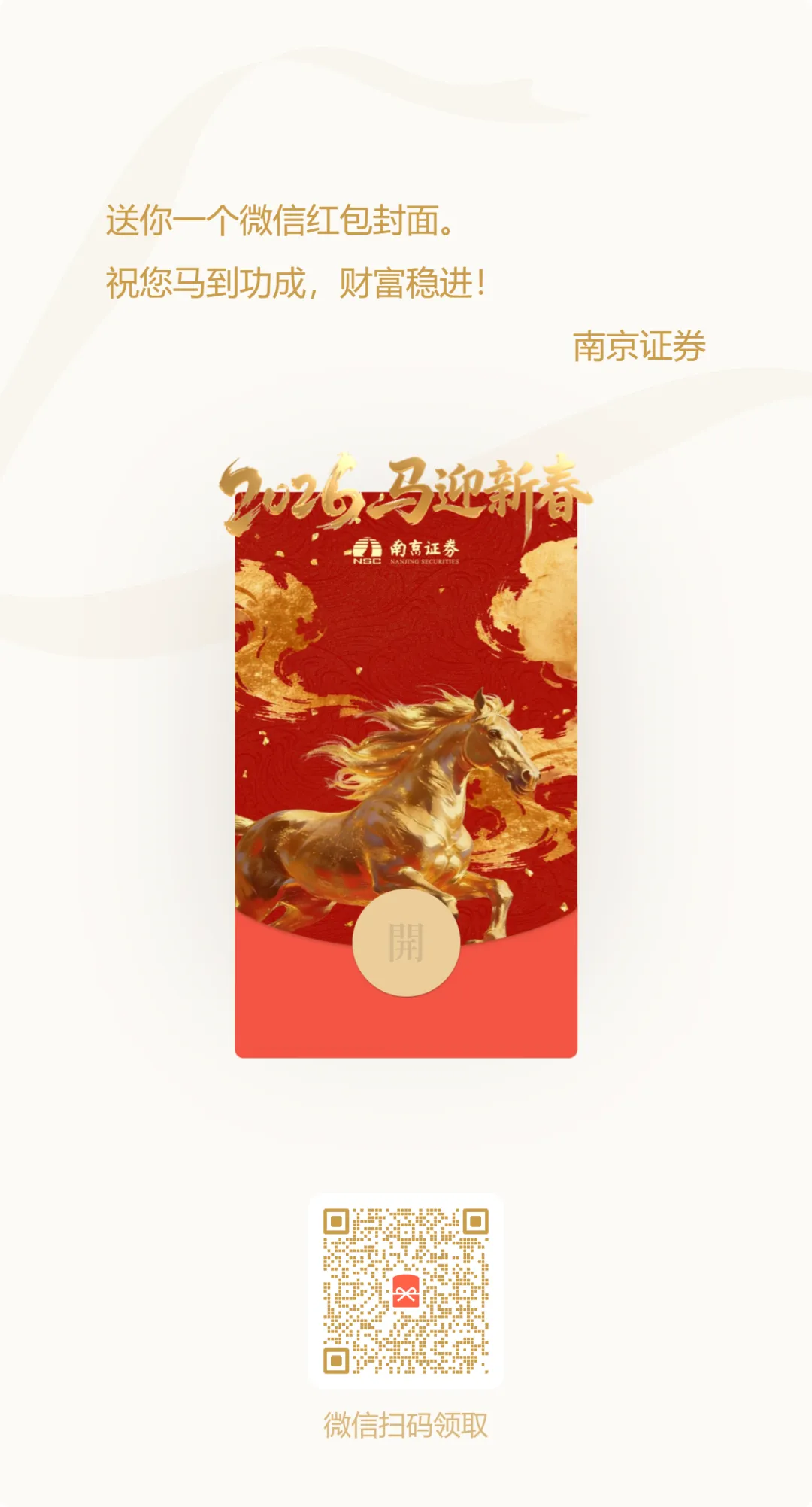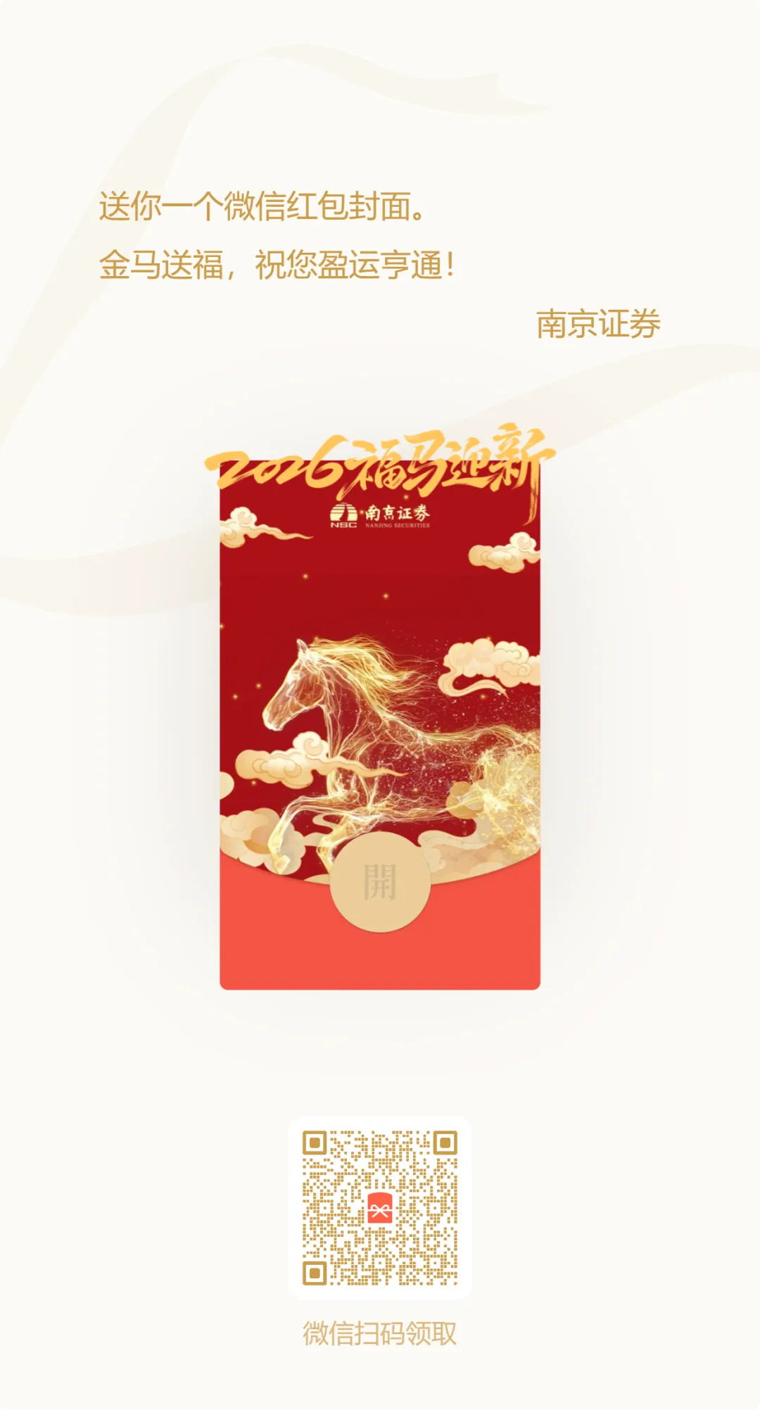 新春佳节即将到来,南京证券精心为您准备了马年主题的红包封面,扫描下方二维码即可领取,每期限量发放,领完即止。请持续关注南京证券微信公众号、企业微信和金罗盘APP,了解最新红包封面发放情况。