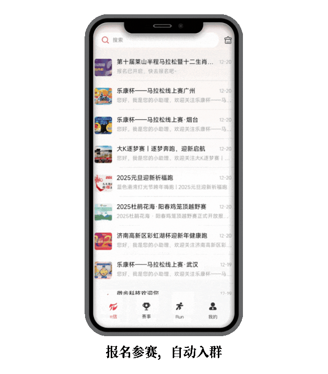 未下载APP的选手,报名后不会自动入群: 报名赛事后,请按此步骤手动加入群聊:打开APP → 进入【我的】→ 点击【我的赛事】→ 找到对应赛事进入【赛事详情】页 → 加入群聊。