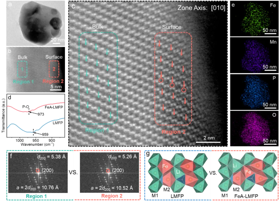 图1. (a−c) FeA−LMFP的TEM图像;(d) FTIR光谱;(e) FeA−LMFP的EDX-mapping分析;(f) 区域1和2的反傅里叶变换图像;(g) 晶体结构图。