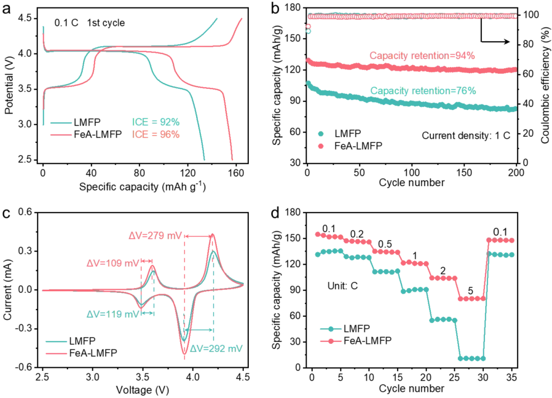 HAADF-STEM图像直观呈现了FeA-LMFP的原子排布特征,体相区域Li位无明显信号,而表面区域的Li位出现明显原子信号,证明二茂铁处理后表面形成了Li-Fe反位缺陷。原始LMFP的FTIR光谱中P-O键振动峰位于959 cm-1,FeA-LMFP向高波数移动至973 cm-1,说明FeA-LMFP中的反位缺陷浓度更高。通过X射线衍射(XRD)精修确定FeA-LMFP和原始LMFP中的反位缺陷浓度分别为3.2%和0.4%。基于球差电镜进行局域结构分析可知FeA−LMFP的体相区域a轴晶格间距为10.76 Å,而表面区域缩减10.52 Å,表明反位缺陷的形成诱导了晶格收缩,导致表面晶格致密化。