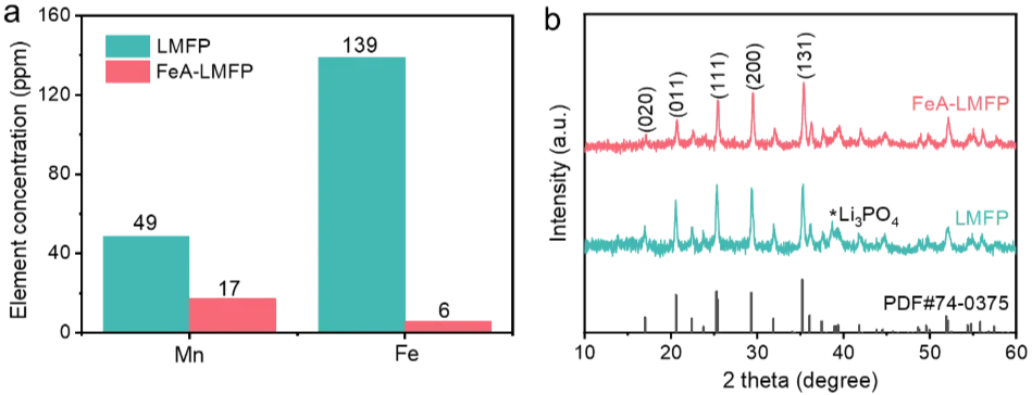 图5. (a) 电极在60℃浸泡7天后的ICP-MS结果;(b) 原始LMFP和FeA−LMFP循环200次后的XRD图谱。