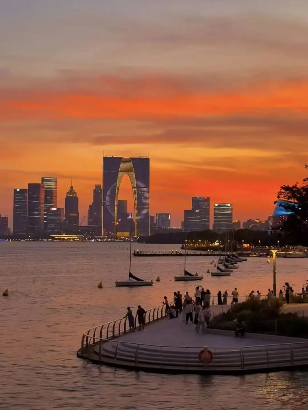 想感受苏州的现代美,就带恩人去金鸡湖!傍晚沿湖散步,吹着湖风看橘子海日落,浪漫值拉满。 晚上蹲一场音乐喷泉,每周五、周六19:30开演,节假日20:00上演,灯光水舞搭配音乐,视觉效果超震撼,看完真的觉得来的太值了。▲图源:网络
