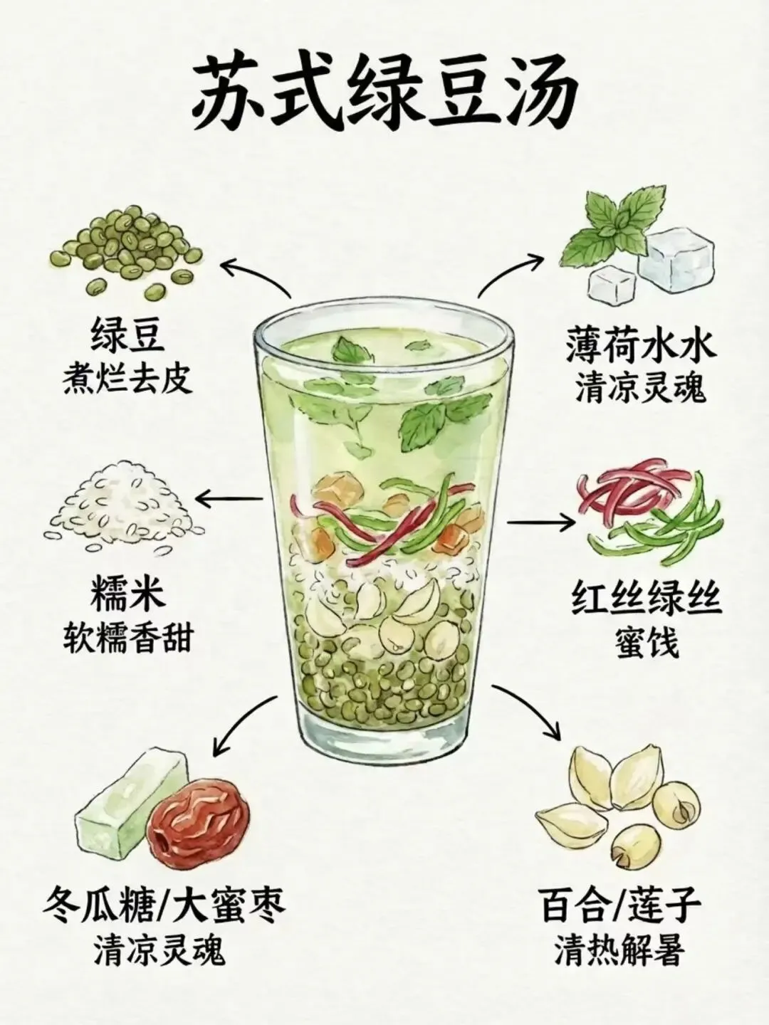 来苏州一定要喝一碗正宗的苏式绿豆汤,和北方的完全不一样! 苏式绿豆汤冰镇薄荷水为底,搭配绿豆、糯米、冬瓜糖、蜜枣、红绿丝,口感层次超丰富,清清凉凉甜而不腻,一口下去暑气全消,这才是江南夏日的专属快乐。▲图源:网络