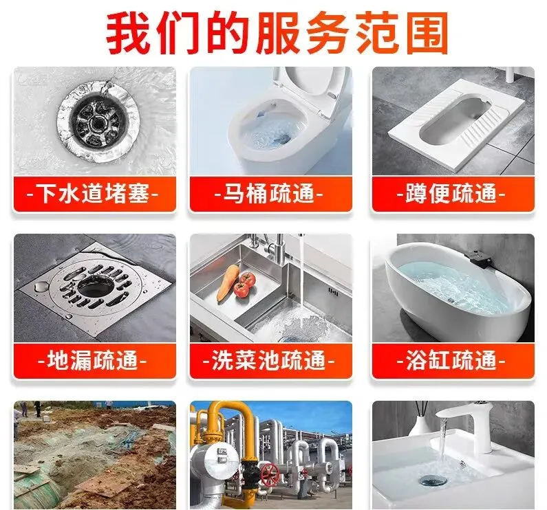 管道疏通:使用专业疏通设备,解决各类下水道、卫生间、地漏、浴缸、菜池、阴沟、马桶、蹲坑等堵塞问题。