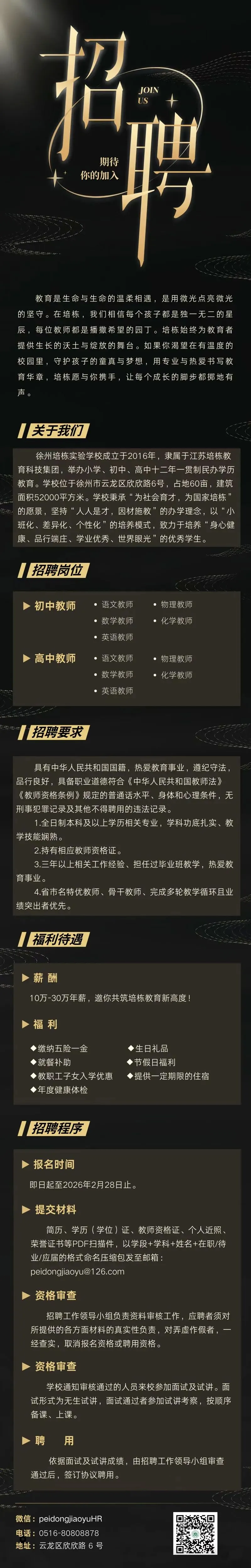 【年薪10万-30万】徐州培栋实验学校招聘初 、高中各科教师.....
