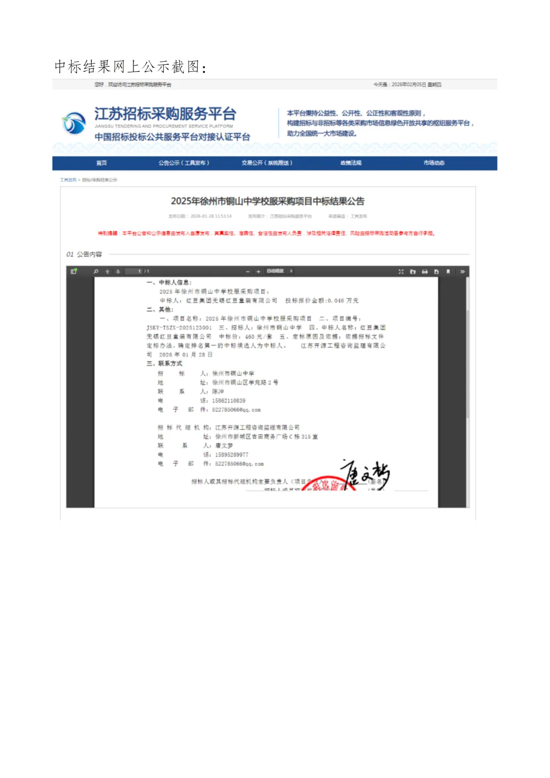 >徐州市铜山中学2025级学生校服中标结果公示