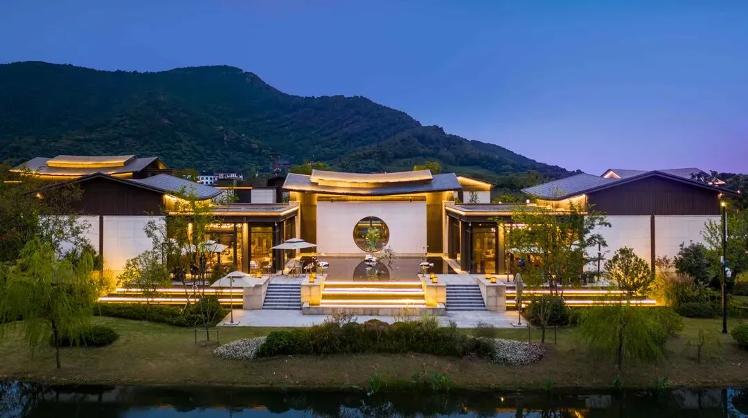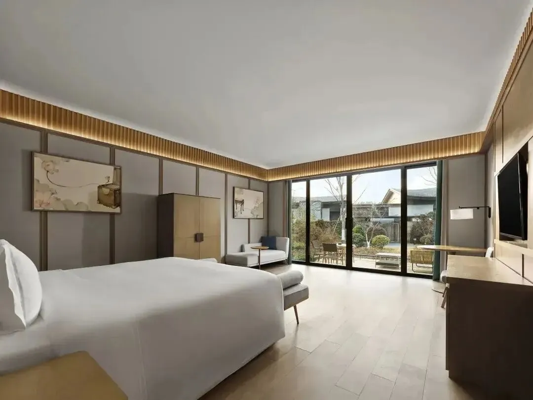 酒店流线型屋顶、满目绿意的水景、3万㎡环湖园林,让人一进门就被“慢”包围。穿过月亮门和光影连廊,大堂豁然开阔——罗汉松、拱门、水声交织,是典型的“江南写意”,让人瞬间从生活的杂音里抽离。