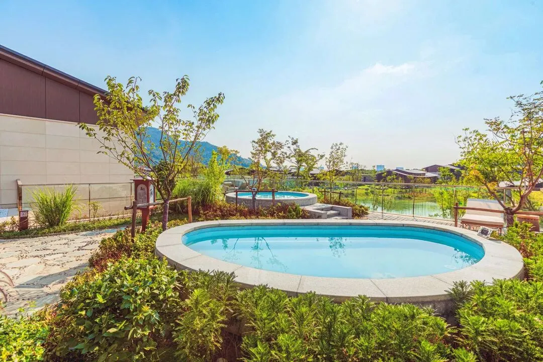 这家酒店的核心体验有两个字:泡汤。酒店引入树山天然地热温泉,打造了12个特色室外泡池,背山面水,景致绝佳。泡在池中,看山雾起、听鸟声回,那种静谧感,是城市温泉没有的氛围。如果你想更私密一点,私汤小墅房型非常值得入手,真正做到“足不出房,就能泡进山水里”。