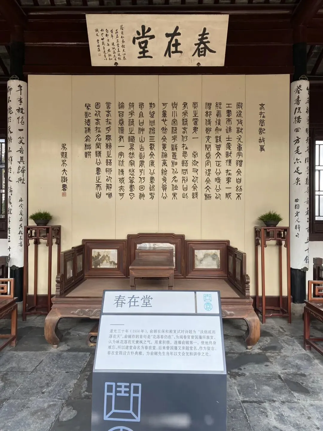 园中建筑朴素,文化意蕴深厚。主厅“乐知堂”为接待宾客、举行庆典之所。西侧的“春在堂”则是其以文会友、讲学著书的核心。此堂得名于一段佳话:道光三十年(1850年),俞樾参加保和殿复试,诗题“淡烟疏雨落花天”,他以“花落春仍在”起句,其积极意境深得阅卷官曾国藩赏识。为纪念知遇之恩,特将此堂命名为“春在堂”,其毕生五百余卷著作也总题为《春在堂全书》。宅门悬挂的“德清俞太史著书之庐”匾额,则为李鸿章所题。