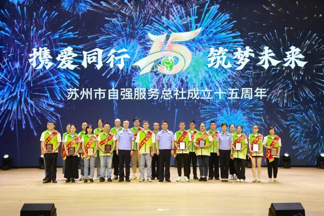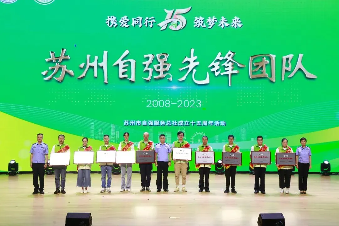 出席嘉宾为“苏州自强先锋团队”“苏州自强之星”颁发奖牌,并合影留念。